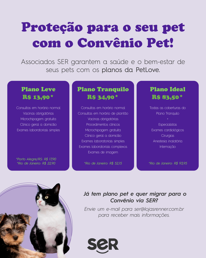 Com o convênio, seu pet ganha um recurso essencial para viver com mais segurança e tranquilidade, com a praticidade da mensalidade descontada direto na folha. 💜 👉Aderir ao convênio é simples: Confira a ficha de adesão, clicando aqui! 📌 Após preencher, envie para ser@lojasrenner.com.br e aguarde as orientações para concluir a adesão. 💡 E não esquece: antes de […]